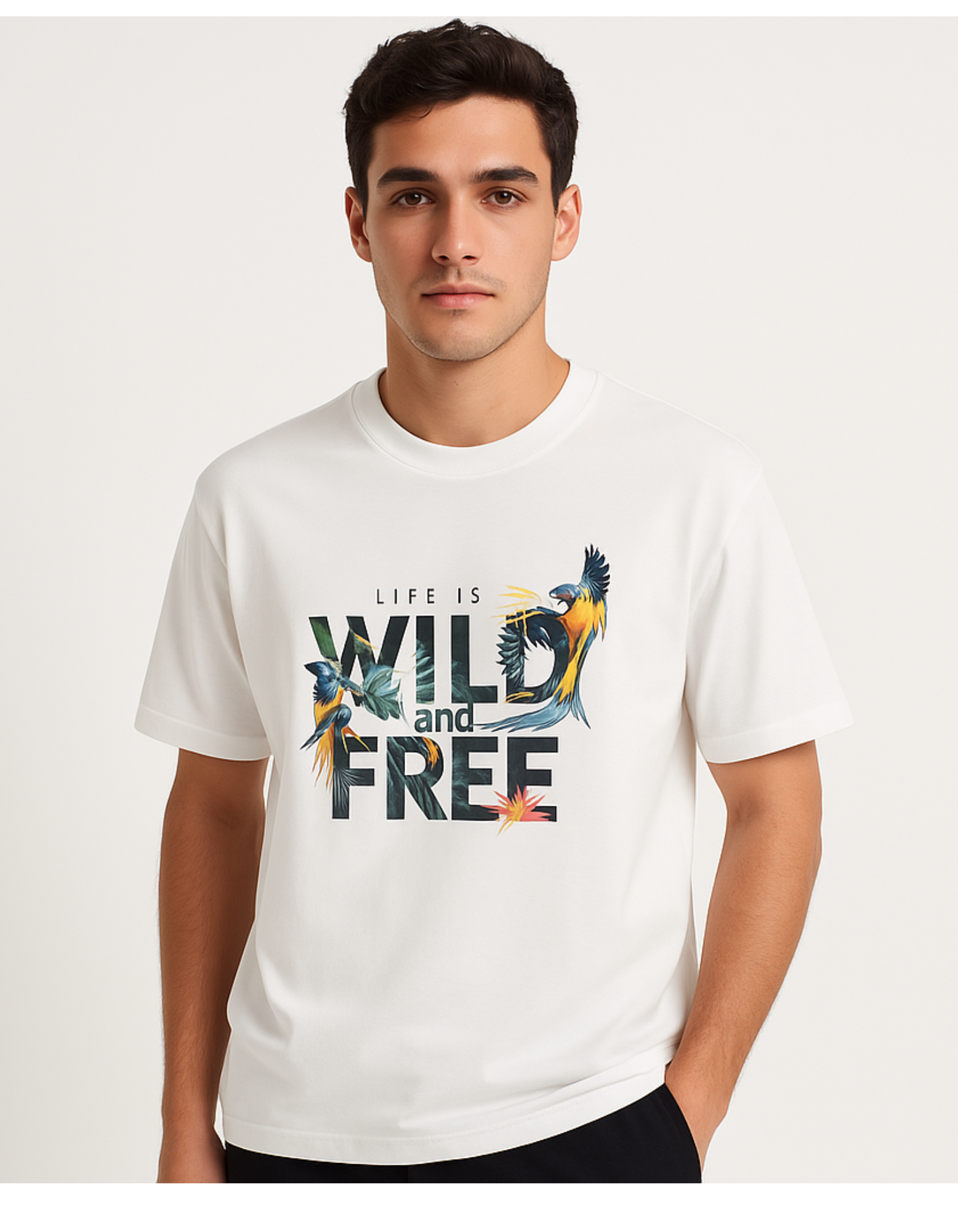 "Trendy white cotton t-shirt for men with bold graphic print ‘Life is Wild and Free’ featuring colorful tropical birds. Perfect for casual wear, soft fabric, and modern fit – ideal for everyday comfort and style."
